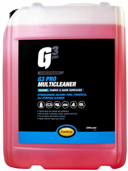 A G3 Pro Multicleaner egy agresszív, mégis biztonságos univerzális tisztítószer (APC), amely minden puha és kemény felületen használható, beleértve a motortereket, a kerékjárati burkolatokat, a szőnyegeket és a kárpitokat. Ez egy szilikonmentes tisztítószer, amely nem színezi el a gumit, a műanyagokat vagy a szövetet. A maximális teljesítmény érdekében tiszta állapotban