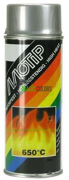 MOTIP Hőálló festék spray - Ezüst 650°C A MoTip hőálló spray-vel fel lehet javítani a nagyon magas hőmérsékletnek kitett felületeket. Használható kipufogócsöveken, kemencékben, rácson stb. , Csupasz fémre permetezhető. Nincs szükség alapozóra! Hőálló akár 800oC-ig. Porszáraz 5-20 perc alatt. Legalább 1 órányi, legalább 160°C-os edzés és szárítás után lesz t