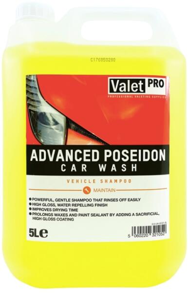 Valet Pro Advanced Poseidon Car Wash ERŐTELJES, MÉGIS KÍMÉLETES AUTÓSAMPON, AMELY KÖNNYEN LEÖBLÍTHETŐ MAGAS FÉNYŰ, VÍZTASZÍTÓ FELÜLETET HAGY MAGA UTÁN JAVÍTJA A SZÁRADÁSI IDŐT MEGHOSSZABBÍTJA A VIASZOK ÉS A FESTÉKTÖMÍTŐ ANYAGOK ÉLETTARTAMÁT EGY ÁLDOZATOS, MAGASFÉNYŰ BEVONAT HOZZÁADÁSÁVAL A MOSÓSZIVACS VAGY A KÉZI KESZTYŰ SIKLIK A FÉNYEZÉS FELETT Az Advanced P