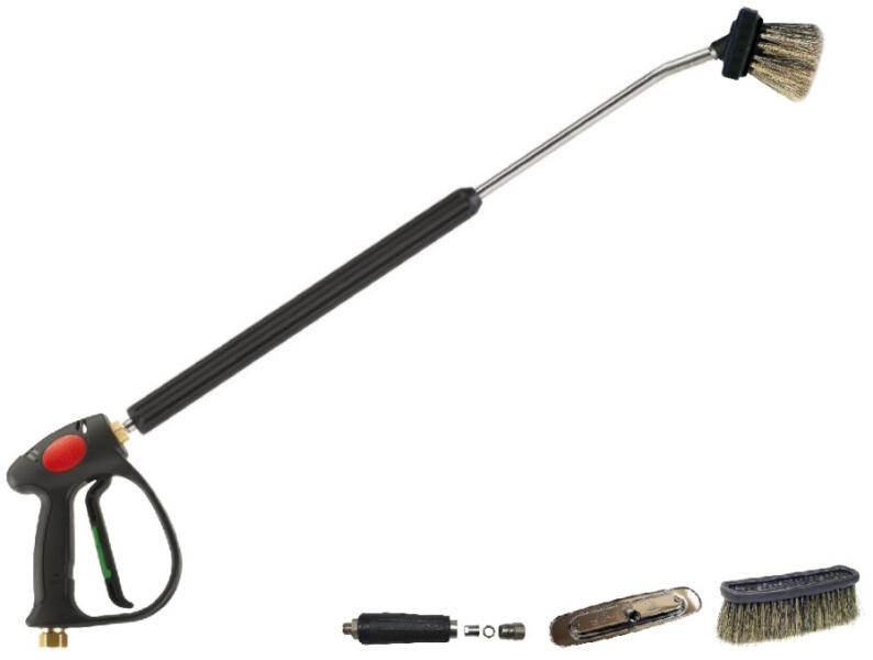 Komplett habkefelándzsa MV925 (zöld ravasz) választható turbóhab szuperhab-injektorral, kefetartó és kefe betéttel A termékösszeállítás használatra kész szerszám , kompletten tartalmazza a mosólándzsa minden alkatrészét. Az alap összeállítás az alábbiakból áll melyet egyedi igény szerint lehet módosítani: -magasnyomású mosópisztoly zöld ravasszal, MV 925 típusú