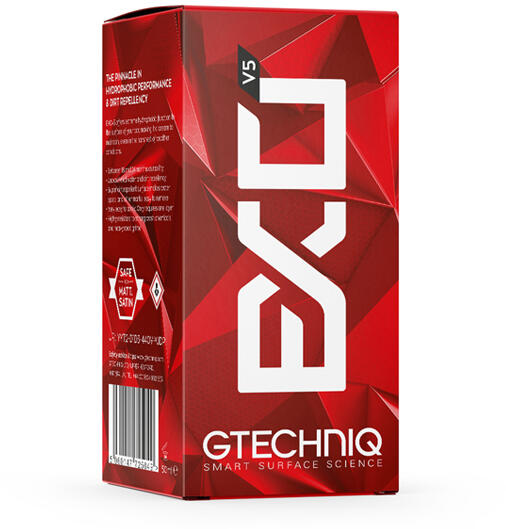 Az EXOv5 kompozit sziloxántechnológiájának köszönhetően könnyedén eltávolíthatóak a vízfoltok és a szennyeződések, kiválóan ellenáll minden mosási vegyszernek, és a mikrokarcoknak. Magasfényű, meleg megjelenésű, rendkívül hidrofób felületet eredményez. Egyenletes réteggel rendelkezik, amely tartósabb és ellenállóbb az útszóró sóval és a mosási vegyszerekkel