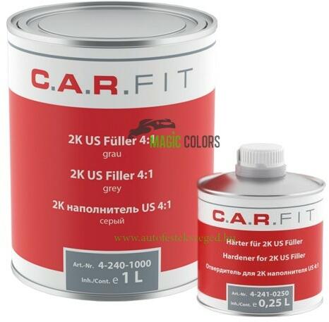 Gyorsan száradó és könnyen csiszolható kétkomponensű töltőanyag az autó felújításához. Az anyag nagy töltőerővel és jó tapadással rendelkezik. Kiváló védelmet nyújt a korrózió ellen. C. A. R. Fit 4:1-es US Füller szett - Szürke (5L)Gyorsan száradó és könnyen csiszolható kétkomponensű töltőanyag az autó felújításához. Az anyag nagy töltőerővel és jó ta