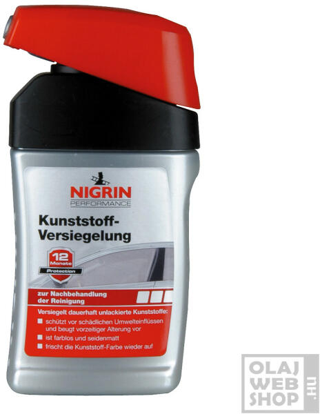 Tisztítás utáni kezeléshez, tartósan lezárja a festetlen műanyagokat. A Nigrin Performance Kunststoff Versiegelung műanyagfelület-lezáró tisztítás utáni kezeléshez, tartósan lezárja a festetlen műanyagokat: véd a káros környezeti hatásoktól és megakadályozza az idő előtti öregedést színtelen és selymesen matt felfrissíti a műanyag színét A NIGRIN Műanyagtömít