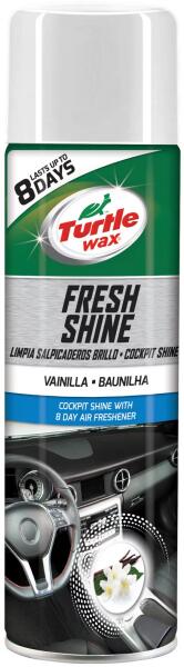 Turtle Wax Fresh Shine visszaadja a belső műanyag felületek eredeti fényét, gyorsan, egyszerűen és könnyen használható spray. Egyedi formulájának köszönhetően az illata akár 8 napig tart, hiszen az illatanyagok fokozatosan szabadulnak csak fel. 5 illatban elérhető. Illat: vaníliaKiszerelés: 500ml