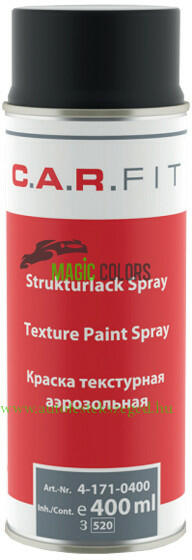 C. A. R. Fit fekete struktúrált festék spray műanyagra (400ml) Tulajdonságok: Gyorsan száradó textúrált festék műanyagokhoz. Eredeti szerkezet helyreállítása sérült műanyag alkatrészeken. Jó fedőképesség és könnyű alkalmazhatóság. Átfesthető. Alkalmazható felületek: Külső és belső műanyag autóalkatrészek, pl. lökhárítók, műszerfalak, ajtókárpitok, tükr
