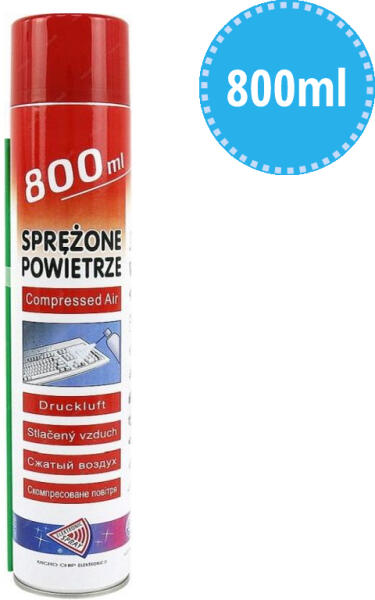 Sűrített levegő spray az elektronika tisztításához - 800ml A sűrített levegő kiváló elektromos berendezések tisztítására. Extra erős, ideális a szennyeződés és kosz hatékony eltávolítására a nehezen megközelíthető helyekről. Alkalmazható ventilátorok, hűtőberendezések, alaplapok és egyéb PCB, optikai berendezések, nyomtatók, faxok, notebookok, számítógépek