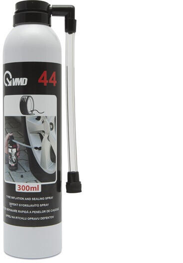 VMD 17244 Defekt gyorsjavító spray 300ml Azonnal felfújódik és eltömíti bármilyen gumiabroncs sérüléseit. Nem károsítja a gumiabroncsot vagy a gumi belsőt. Folyékony gumi komponense eltömíti a lyukat, a hajtógáz pedig a kerékben közlekedésre alkalmas nyomást alakít ki. Használat után max. 50 km/h sebességgel közlekedjünk, és mielőbb javíttassuk meg a gumit! A palack