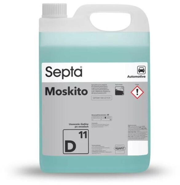 A szerves rovarmaradványok eltávolítására szolgáló termék autók karosszériájáról, ablakokról és fényszórókról. A Septa Moskito D11 egy professzionális autóipari vegyszer a szerves rovarmaradványok eltávolítására a karosszériáról, ablakokról és fényszórókról. Biztonságos a mosott felületeken. Felhasználásra kész termék.