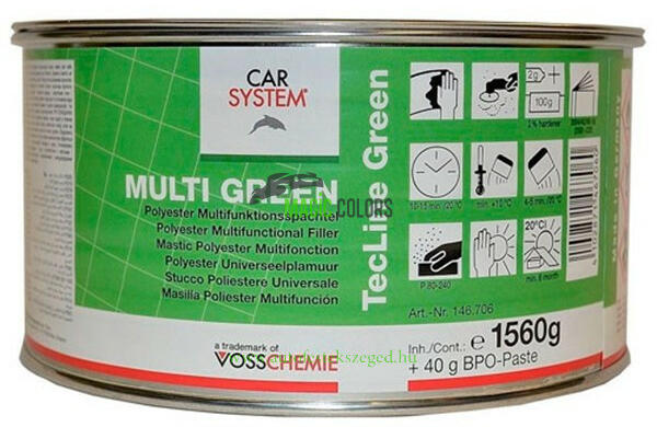 CarSystem multigreen gitt ( 1,6 Kg) Könnyű csiszolhatóság Száradás: 15 - 20 perc (20°C-on) CarSystem multigreen gitt ( 1,6 Kg) Univerzális használatra minden acél-, alumínium- és horganyzott karosszéria javításakor, valamint GRP és fa részeknél. Jellemzők: Többfunkciós gitt különböző felületekhez. Ez a multifunkcionális gitt teljesen új technológiával kifejlesztett gi