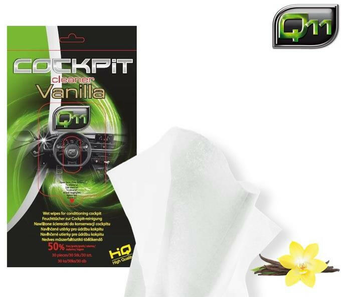 Q11 | műszerfalápló & tisztító kendő | vanília illat | matt hatás | 30 db Műszerfal tisztító és ápoló nedves kendő. Tisztítja a felületeket, véd az öregedéstől és az UV sugaraktól. Megakadályozza a por lerakódását és kellemes illatot hagy maga után. 1 csomag 30 darab kendőt tartalmaz.
