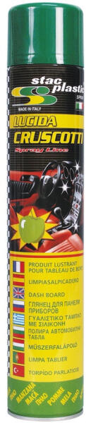 Stac Plastic 778093 Műszerfalápoló spray zöld alma illat 750ml Tisztít és ápol minden belső műanyag, PVC és gumifelületet. A műszerfalápolót használva speciális filmréteg keletkezik a használt felületen, ami távol tartja a port és a különböző szennyeződéseket és hosszantartó csillogást ad a műszerfalnak. Elérhető 5 féle illatban. Kellemes zöld alma illatú. Haszn