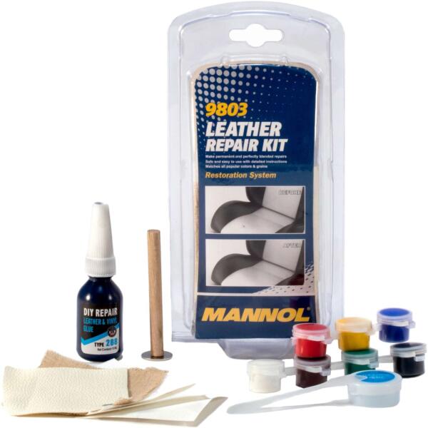 MANNOL Leather Repair Kit 9803Bőrjavító készlet-kényelmes és könnyen használható készlet természetes és mesterséges bőrből és vinilből készült felületek helyreállításához. Használható mind az autó belső kárpitjainak és paneleinek javítására, mind a mindennapi életben bútorok, bőrruházat, cipők, táskák és bőröndök, rövidáruk, valamint csónakok, motorke