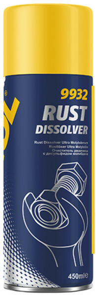 SCT-Mannol 9932 - Rust dissolver - Molibdén tartalmú rozsdaoldó, 450ml Alkalmazásával sok idő, energia és fáradság takarítható meg. A berozsdásodott, nehezen bontható csavarok, kötések eredményes szétszerelését teszi lehetővé. A legkisebb résekbe is behatol, fellazítja a rozsdát. Kenőhatása révén a szétszerelést megkönnyíti. Korrózió gátló hatású. Összetevők
