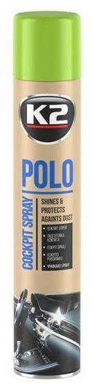 K2 | POLO műszerfalápoló | zöldalma illat | fényes hatás | 750 ml A K2 POLO COCKPIT spray a műszerfal ápolására és tisztítására. Speciális nanorészecskéket tartalmaz, melyeknek köszönhetően visszaadja a megtisztított elemek eredeti színét és fényét, valamint kifejező textúráját. Antisztatikus hatású, véd a por ellen és véd az UV-sugarak káros hatásaitól. Megak