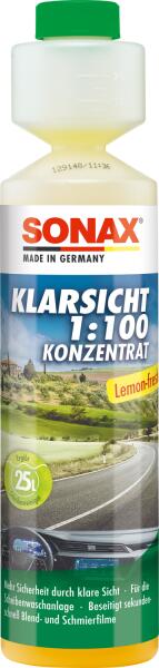 Sonax KlarSicht Lemon Fresh 1:100 koncentrátumNyári időszakban, a szélvédőmosó-berendezésekhez való koncentrált tisztító adalék. Rendkívül hatékony és gazdaságos, mert mindössze 25 ml koncentrátum 2,5 liter szélvédőmosó folyadékot képez. A szélvédőről a rovarokat, az olajat, a kormot, a szilikont és az egyéb kilátást zavaró szennyeződéseket csíkmentesen eltáv