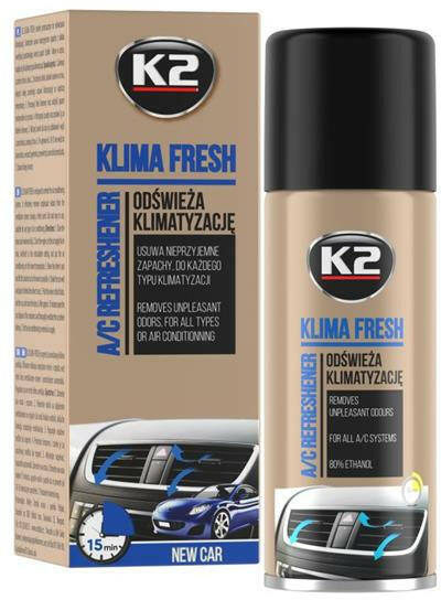 K2 | Klímatisztító bomba New Car | 150 ml Könnyen használható, hatékony szer a légkondicionáló berendezések tisztítására. Szétszerelés nélkül biztosítja az optimális tisztítást és a kellemetlen illatok semlegesítését. Folyamatos használata megszünteti a légkondicionáló berendezés negatív hatását az emberi szervezetre. Kellemes, friss illatot hagy maga után. Bár