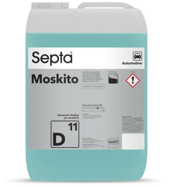 A Septa Moskito D11 egy professzionális autóipari vegyszer a szerves rovarmaradványok eltávolítására a karosszériáról, ablakokról és fényszórókról. Biztonságos a mosott felületeken. Felhasználásra kész termék. Használat: Fújja be a folyadékkal a mosott felületet, majd öblítse le vízzel, lehetőleg nagy nyomáson. Elérhető kiszerelések: 0,75L, 5L, 10L. Professzionál