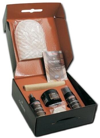 A készlet tartalmazza: Charme tisztítóhab Charme hidratáló Charme tápláló krém Charme bőrkesztyű szett Charme latex szivacs Charme mikroszálas törlőkendő