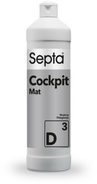 A Septa Cockpit Mat D3 egy professzionális autóipari vegyszer a járművek belső terének tisztítására. A műanyag alkatrészeket mattá teszi. Tökéletesen tisztít és eltávolítja a szennyeződéseket. Nem zsírosít, kellemes illatot hagy maga után. Magas koncentrációjú termék. Használat módja: Fújja be a mosott felületet a folyadékkal, majd törölje át egy ronggyal. Tiszt