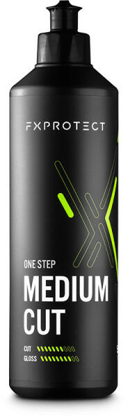 FX Protect Medium Cut Polírozó Anyag 500ml Közepes polírozó paszta MEDIUM CUT / ONE STEP, amelynek célja a mérsékelt karcolások eltávolítása a festék felületéről. Magas fényességet ad az EGY LÉPÉSES polírozáskor. Eltávolítja a P2000 nagyságú mikrokarcolásokat. Nagy hatékonyságú és nem porol, ennek köszönhetően lerövidíti a munkaidejét. Víz alapú, nem tartalma