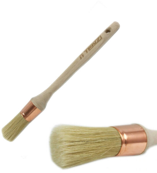 Professzionális autókozmetika ecset , természetes sörtékkel és natúr fa nyéllel. A természetes sörték puhák, így kíméletesek minden felülettel, legyen az autó külsején vagy belsejében. A kényelmes nyél stabil tartást biztosít, és anyaga miatt egyáltalán nem csúszik. Vegyszerrel való használatra is alkalmas. A prémium megjelenést a valódi réz sörtetartó hüvelyek