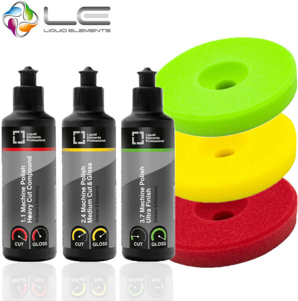 Liquid Elements Polírszett - Excenteres gépekhez Tárcsa méret: 125mm Polírpad méret: 125/145mm Paszta kiszerelés: 250ml Liquid Elements Polírozó Paszták - Professzionális Autóápolás A Liquid Elements polírozó paszták, beleértve a Heavy Cut (1.1), a Medium Cut (2.4) és az Ultra Finish (3.7) termékeket, a legújabb technológiával készülnek, amelyek garantálják a kiváló f