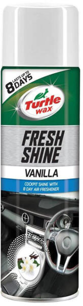Turtle Wax Fresh Shine Vanilla, Műszerfalápoló spray 500ml, Vanília Tisztítja és helyreállítja a matt felületet minden belső műanyagon. Kiváló illat, 8 napos lassú felszabadítási technológiával. Hosszantartó antisztatikus pajzs, amely visszataszítja a port és a piszkot. A műszerfaltisztító alkalmazható minden belső műanyag, PVC és gumi felületen, melyeknek hosszan tart