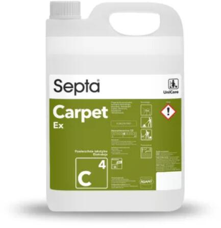 Folyadék extrakciós technológiával történő szőnyegtisztításhoz. A Septa Carpet Ex C4 professzionális vegyszer a szőnyegek extrakciós technológiával történő tisztításához és mosásához. A módszer gyors, hatékony, biztonságos és gazdaságos. Kellemes illata van. Használati utasítás: hígítsa fel hideg vízzel. Használat előtt alaposan keverje fel. Tisztítsa meg extr