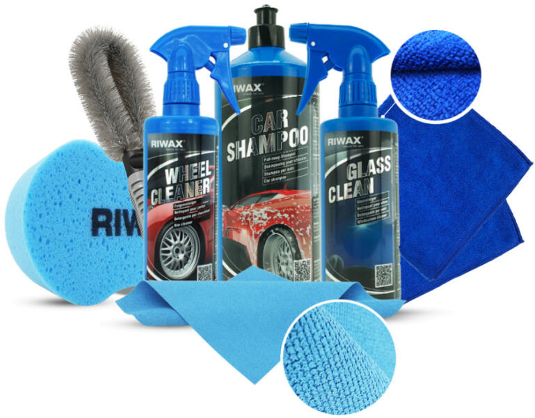 A szett tartalma: - Car Shampoo - Autósampon - 1000 ml - Glass Clean - Ablaktisztító - 500 ml - Wheel Cleaner - Keréktisztító - 500 ml - Riwax mosószivacs - Riwax mikroszálas kendő 2db - Szárítókendő kék HD - 40x35 cm - Felnitisztító kefe szimpla Car Shampoo – Autósampon – 1000 ml egy festékbarát autósampon, kiemelkedő tisztító hatással. A magas szennyeződés felvevő