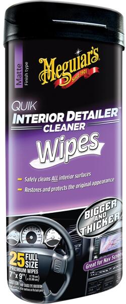 Meguiar's Quik Interior Detailer Wipes Elég sok időt töltesz az autóban, gyakorlatilag az autóban élsz. A Meguiar's Quik Interior Detailer beltéri tisztító kendők használatával gyorsan és egyszerűen tisztán tarthatja a belső teret. Minden belső felületet portalaníthat: vinil, bőr, gumi, fém, még az LCD-képernyőket vagy a navigációt is. Visszaállítja a felületek eredeti