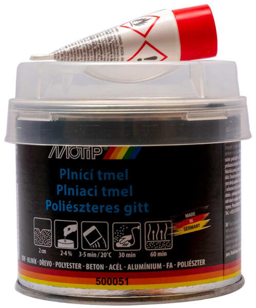 Motip 500051 Poliészteres gitt, 250 g A Motip poliészter alapú gitt mélyedések, egyenetlenségek, karcok kiegyenlítésére alkalmas univerzális készítmény. Enyhén thixotróp, rugalmas, könnyen csiszolható, ezért mind fémekre, mind fára és betonra használható.