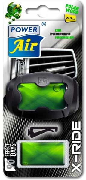 Power Air X-Ride Modern és egyedi kialakítású membrános légfrissítő. Egyszerű használat - vágja ki a membránt, szerelje össze a terméket, és rögzítse a jármű szellőzőnyílásához. Egy további utántöltőt tartalmaz.
