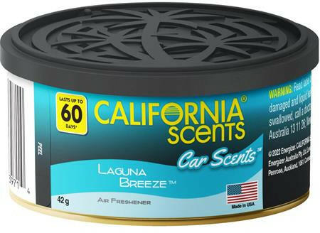 A Autóillatosító konzerv, 42 g, CALIFORNIA SCENTS Laguna Breeze (AICS04) A California Scents Car 100%-ban ökológiai illóolajokon alapul. Az ilyen típusú csomagolásnál nem áll fenn a műanyagok/ műszerfal károsodása a parfüm/gél szivárgása miatt. Minden pléhdoboz ingyenes illat intenzitást-szabályzót kap, az illat az autóban akár 60 napig is kitarthat! Kellemes, frissítő i