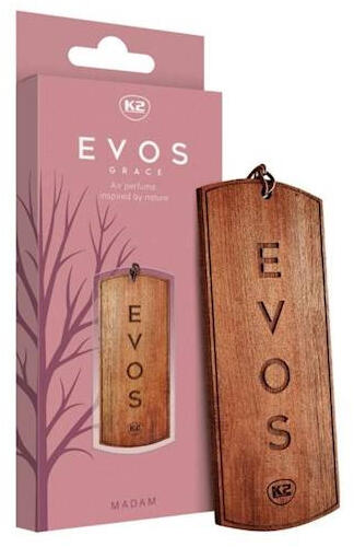 A K2 EVOS egy természet ihlette, elegáns megjelenésű, rendhagyó autóparfüm természetes fa medál formájában. A tömör fából készült, kétoldalas gravírozású medál egyedi stílust ad a belső térnek. A speciálisan válogatott illóolajok hosszú ideig biztosítják az illat gazdagságát és mélységét. A fonott, sötét zsinór segítségével bárhol felakasztható. Illat m