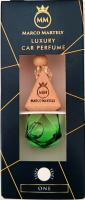 Marco Martely autóparfüm, One, 7ml, dobozban (MMF005) Zamatos mandarin, papaja, üde bergamott és citrom ötletes jegyeivel bontakozik ki. Virágos szívében az ibolya, jázmin, gyöngyvirág és rózsa aromás harmóniája elevenedik meg, amit gyengéden fűszeres színezettel tölt el a szerecsendió. Az illatkompozíció alapja ugyanakkor állati eredetű pézsma, cédrus és ámbra érzék