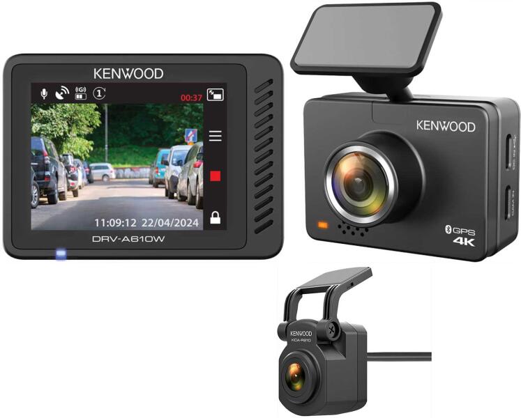 Kenwood DRV-A610W 4K (3840 x 2160px) menetrögzítő kamera Wifi csatlakozással, KCA-R210 QHD hátsó kamerával. 3D gyorsulásérzékelővel, GPS-el, 2" színes TFT kijelző. Extra kompakt méret. WDR, automatikus fényerő kompenzáció, beépített akkumulátor (szuper kapacitor), öntapadós tartó konzol. A rögzített anyag microSD memóriakártyára kerül, időbélyeggel ellátott és a m