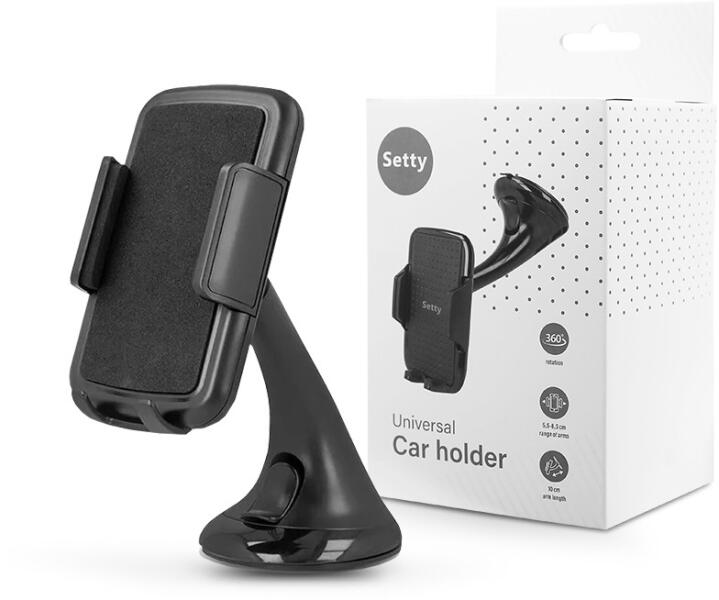 - Setty univerzális autós tartó okostelefonokhoz és navigációhoz. - Az erős tapadókorong stabilan rögzíti a terméket a szélvédőüvegen- A szélessége állítható: 55-85 mm - A kar hossza: 100 mm - A fej 360 fokban forgatható