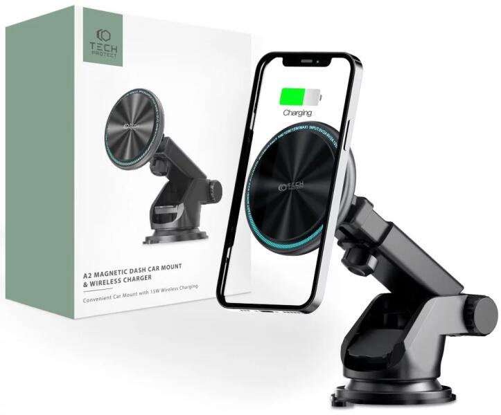 Tech-Protect A2 Fekete Autós tartó tapadókoronggal QC Magsafe 15W töltéssel, 926723 A Tech-Protect A2 műszerfalra szerelt dizájnos autós tartó, amely képes Apple eszközök Magsafe technológiával történő töltésére, maximum 15 W teljesítménnyel. Masszív, állítható hosszúságú karral van felszerelve, amely forgatható fejjel kombinálva tökéletes illeszkedést és kivál