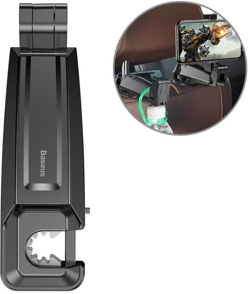 BASEUS telefontartó az ülés fejtámlájának fémrúdjára erősíthető, 64mm – 90mm szélességű telefonhoz A termék tulajdonságai 2 in 1: akasztókampó (pl. táskának) és telefontartó egyben Univerzális tartó, mely a piacon található autómodellek 99%-val kompatibilis A telefontartó csipesz szélessége 64-90mm, ezért 4 - 6,5 colos mobiltelefonokkal kompatibilis Felhelyezése