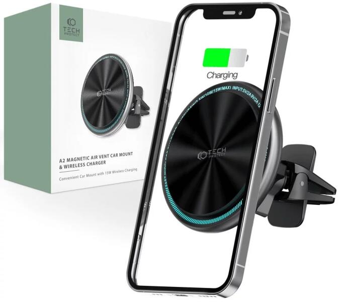 Tech-Protect A2 Magnetic Magsafe Vent Car Mount Wireless Charger, Magsafe kompatibilis vezeték nélküli töltő és tartó, szellőzőrácsra, mágneses, 15W, fekete Tech-Protect A2 szellőzőnyílásra szerelt dizájn autós tartó, Magsafe technológiás Apple készülékek töltésének lehetőségével, maximum 15W teljesítménnyel. A beépített erős mágnes biztonságosan tartja okostele