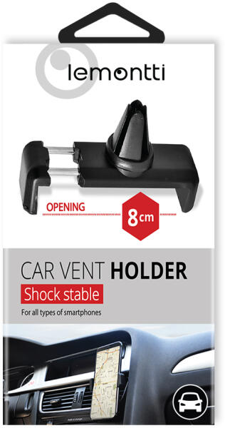 Lemontti Autós tartó szellőzőrácsra, Fekete A Lemontti autós tartó a legkisebb univerzális autós tartó. Nagyon könnyen hozzáilleszthető a szellőzőrácshoz a pengékkel, és hatékonyan tartja az okostelefont, ha böngészni szeretne kedvenc alkalmazásaival, vagy egyszerűen zenét hallgatni. A szorítás szilárd, de finom, így okostelefonján használat után nem lesz nyoma. Forg