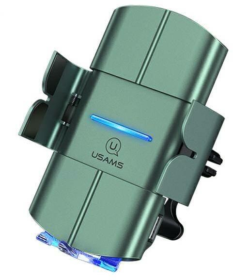 USAMS US-CD133 Automatikus autós tartó gyors 10 W-os vezeték nélküli töltéssel, a szellőzőrácsra szerelve. Az intelligens chip használatának köszönhetően a fogantyú felismeri a készüléket és automatikusan rögzíti a karokat, valamint azonosítja a gyors induktív töltés lehetőségével rendelkező készülékeket. A vezeték nélküli töltés nélküli telefonok az oldals