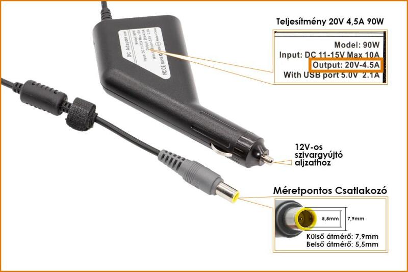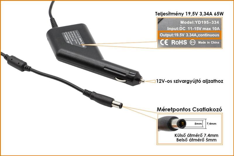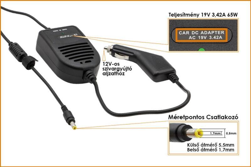 Gyárival megegyező minőségű 65 Wattos helyettesítő autós laptop töltő Acer laptophoz, 12 hónap csere garanciával.