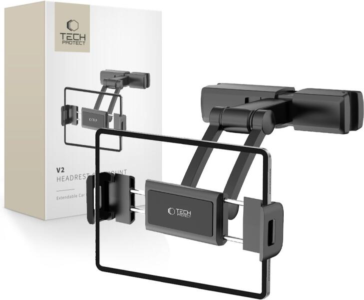 Univerzális Tech-Véd V2 autós tartó, amely fejtámlára szerelhető, és olyan eszközökre van tervezve, mint a telefon vagy tablet. Kényelmes és egyszerűen használható, ideális hosszú utak során, biztosítva a szórakozást mind Önnek, mind az utasoknak. Tartós és könnyű anyagokból készült, például alumíniumötvözetből, polikarbonátból és szilikonból. A tartó állí