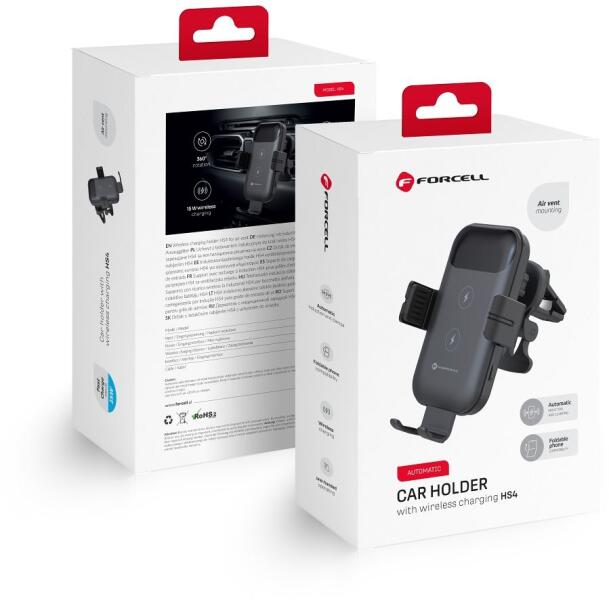 A Forcell HS4 autós tartó, amely a légbefúvóra szerelhető, azoknak az eszközöknek készült, amelyek támogatják az induktív töltést, beleértve a legújabb hajlítható Samsung Z Flip telefon sorozatot. Lehetővé teszi, hogy akár 15 W teljesítménnyel töltse őket. A forgócsukló és az automatikusan kinyúló karok (gombnyomás után) egyszerűvé teszik az okostelefon rögzít