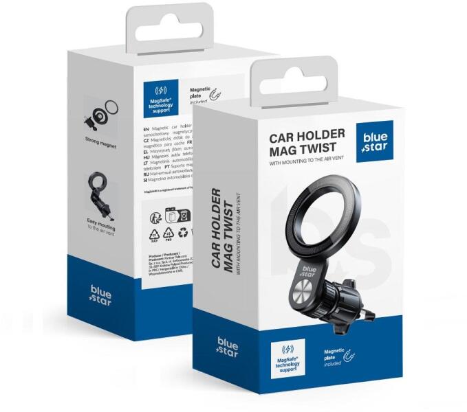 BLUE STAR MAG TWIST egy mágneses autós telefontartó, amely biztosítja a kényelmes és biztonságos rögzítést az okostelefon számára a jármű légbeömlő rácsára. A MagSafe technológiával kompatibilis tartó ideális megoldás az iPhone 12 sorozat vagy újabb készülékek, valamint mágneses rögzítést támogató tokok felhasználói számára. A tartóba épített erős mágnes