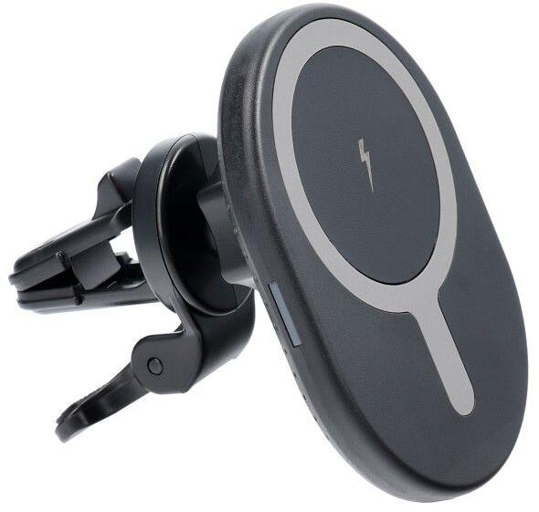Autós tartó vezeték nélküli töltéssel. A légbefúvóra szerelve. Lehetővé teszi az okostelefon biztonságos használatát vezetés közben. Kiváló minőségű anyagokból készült - ABS és akril, garantálja a sérülésekkel szembeni ellenállást és a hosszú távú használatot. Támogatja az iPhone 12, 13 és 14 sorozatú mobiltelefonok MagSafe vezeték nélküli töltését, am