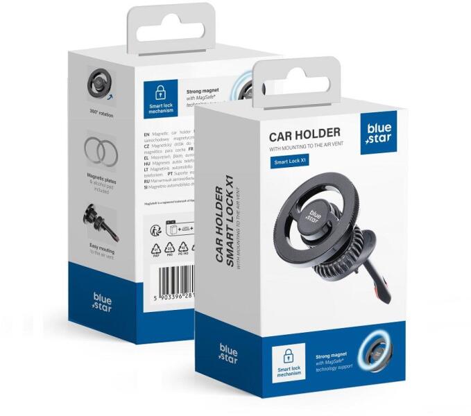 BLUE STAR FLIPTOK X1 egy mágneses autós tartó, amely biztosítja az okostelefon kényelmes és biztonságos rögzítését a jármű légbeömlőjéhez. A tartó kompatibilis a MagSafe technológiával, így ideális megoldást nyújt az iPhone 12 sorozat vagy újabb készülékek, illetve a mágneses rögzítést támogató tokok felhasználói számára. A tartó előnye forgatható kialakít
