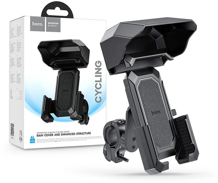 - Hoco H31 okostelefon-tartó a kerékpár, robogó, roller, motorkerékpár kormánykeretére rögzíthető. - A tartó kompatibilis a 4,5 és 7,0 coll közötti átmérőjű okostelefonokkal. - A tartó állítható rögzítőkkel rendelkezik, a beépített védőtető pedig védelmet nyújt a kedvezőtlen időjárási körülmények, például a napsütés, az eső vagy a hó ellen. - A tartó