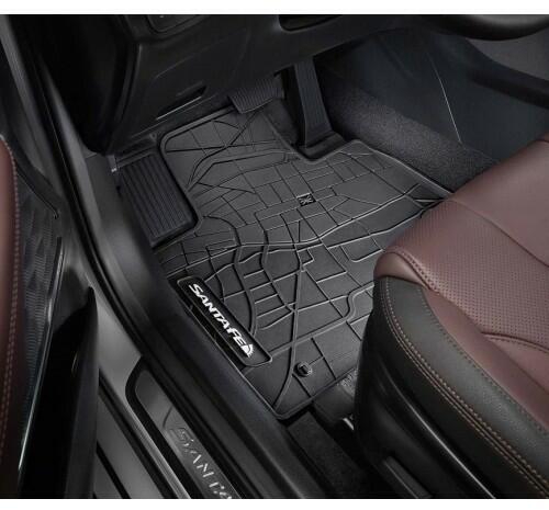 Méretpontos, eredeti Hyundai Santa Fe gumiszőnyeg. Hyundai Santa Fe 2018-2020-ig gyártott autókhoz. Hyundai Santa Fe gyári gumiszőnyeg, méretpontos, tökéletesen illeszkedő, a vezető oldalon a gyári pontokra a padlóhoz rögzíthető, SantaFe logóval ellátott gumiszőnyeg. A Hyundai minden időjárás esetén használható gumiszőnyegei ideális védelmet nyújtanak a jármű lábter